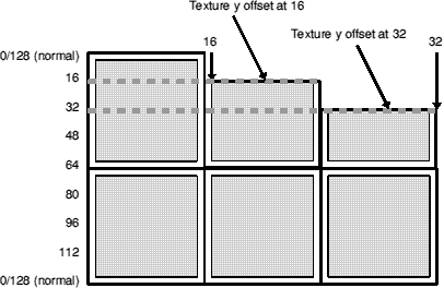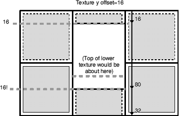 As you can see, every time the ceiling drops by 16 units, so does the texture. What we need to do is to make it ignore the top 16 units of the texture, so the rest gets drawn in the right place. Hang on, isn't that what texture y offsets are for...?
