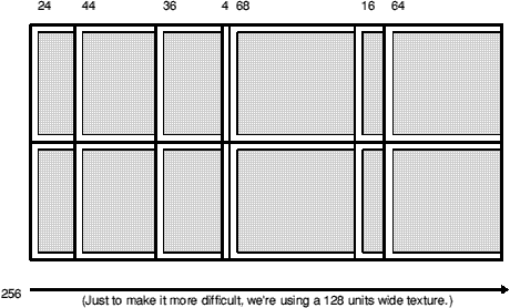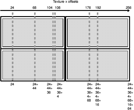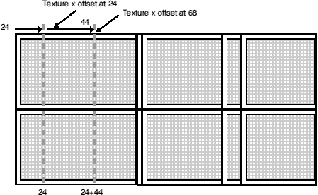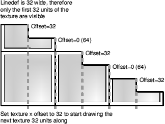 Now, how long is the next one? 44 units. And we've just put a texture x offset of 24 units on it, meaning that by the end of the next linedef, the offset will have reached 24+44 units, or 68 units.