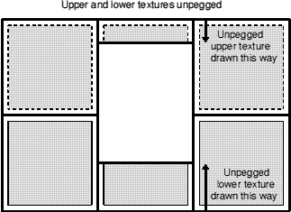 And speaking of doors, you might have guessed that the reason upper textures are drawn the way they are by default is that, if they were drawn from the top down, they too would stay firmly in place when the door opened! You can observe this effect by unpegging a door and watching it as it opens. It works with moving floors and crushers too.